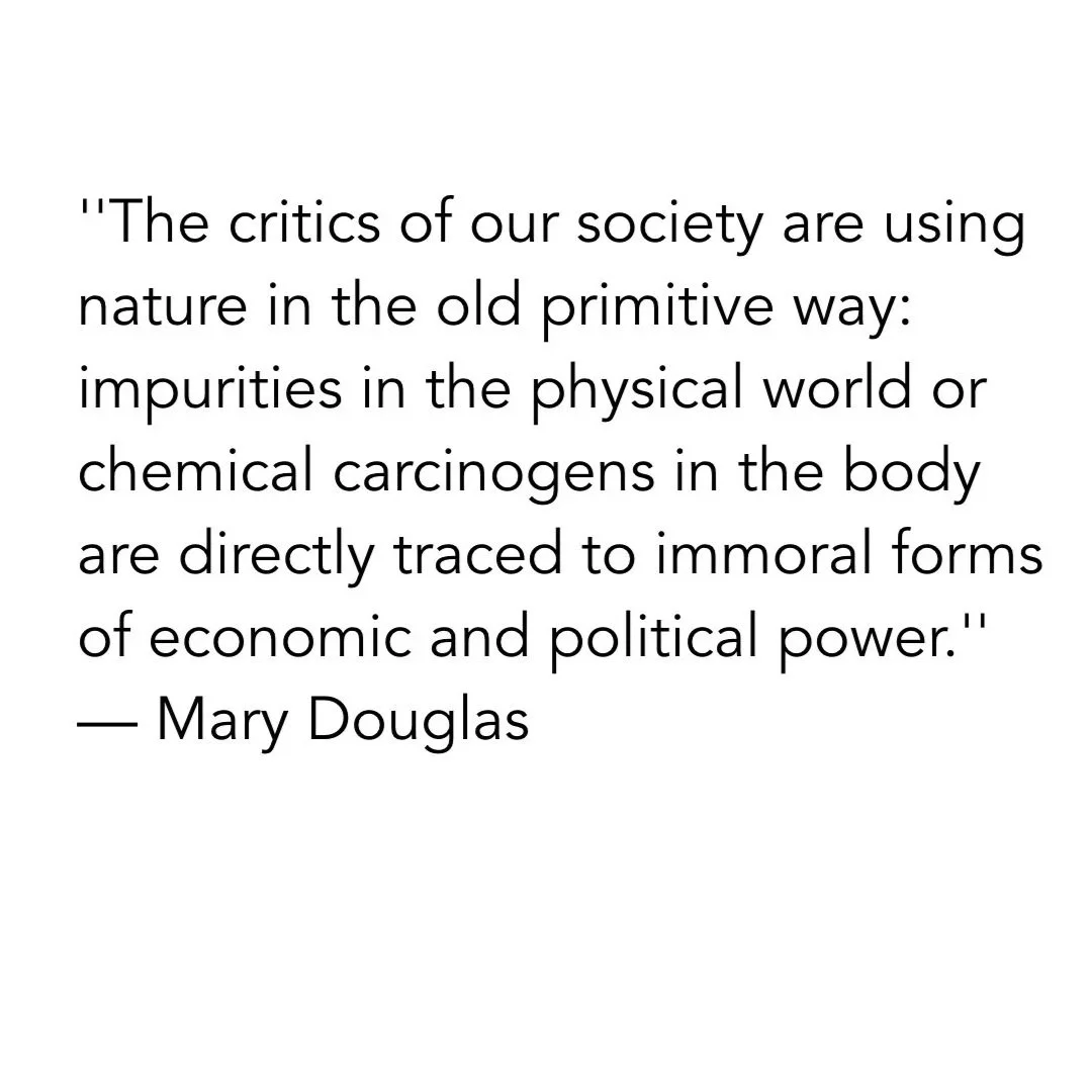 In other words, the public came to see nuclear as dirty only after it saw it as dangerous, and thus immoral. ''The critics of our society are using nature in the old primitive way: impurities in the physical world or chemical carcinogens in the body are directly traced to immoral forms of economic and political power,” wrote anthropologist Mary Douglas, who analyzed anti-nuclear activists the same way she did other cultures. “Laws of nature are dragged into sanction the moral code.”